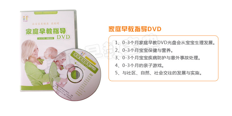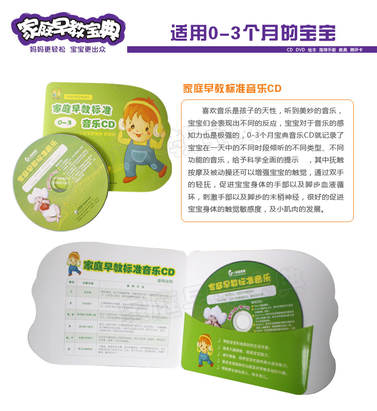 全套家庭早教宝典共分为10盒,分别适用于(0-3个月)、(4-6个月)、(7-9个月)、(10-12个月)、(13-15个月)、(16-18个月)、(19-21个月)、(22-24个月)、(25-30个月)、(31-36个月)10个年龄段的宝宝及家长。每套宝典又包括《家庭早教专业指导手册》、《家庭早教专业指导光盘DVD》、《家庭早教标准音乐》、《家庭早教亲子共读绘本》(0-3个月为《视觉激发图卡》)、《家庭早教专用教具》、《家庭早教专用测评卡》等产品。
