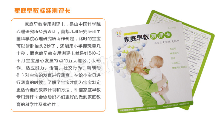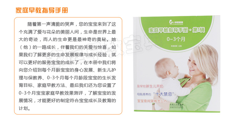 我国第一套家庭早教规范化产品----“家庭早教宝典”由北京华夏爱婴教育机构、中国国际幼儿教育研究院、中国国际蒙台梭利教学研究会历时七年,经过了华夏爱婴全国400多家早教中心12000多例家庭的实践,在国家相关部门和业内知名专家的支持下成功上市。产品既能让宝宝在家里接受先进科学的早期教育,同时也给经销商带来了丰厚的利润。