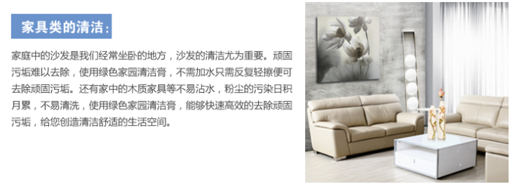 4布沙发,各种地板和装饰墙纸的擦拭:可取适量清洁膏于60度左右的温水中用毛巾或百洁布擦拭。