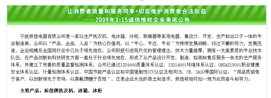 宁波辰佳电器有限公司是中国家电协会会员单位、《家用滚筒干衣机性能测试方法》和《家用和类似用途电器的安全 室内加热器的特殊要求》国家标准化起草单位、参与讨论起草《家用不用洗衣粉洗衣机》、《电动洗衣机 洗衣机可靠性能鉴定及验收实验方法》、《家用和类似用途电器的安全 洗衣机的特殊要求》国家标准成员单位。公司积极引进现代化的管理理念,技术力量雄厚,拥有一支高素质的专业技术队伍,在产品创新和科技研发方面一直处于行业领先地位。公司拥有100多项专利技术,同时与多所国内一流的高等院校合作建立产品研发中心,国家级实验室正在审批建设中,形成了从产品设计开发、制造、检测和售后服务一条龙的生产服务体系,并建立了完善的质量监督检测体系。公司已通过ISO9000质量体系认证、ISO14001环境体系认证、OHSAS18001职业健康安全管理体系认证、计量检测体系认证、中国节能产品认证和中国强制性CCC认证及相关CB、CE、SASO等国际认证。公司在国内设有100余个销售办事处,销售网点遍布全国。在国外远销亚、美、欧等60余个国家地区。辰佳商标被认定为“中国驰名商标”,成为全国家电行业的主力军和领军企业。公司在产品销售市场上享有较好知名度和美誉度,业务呈跨越式发展,市场份额逐年飙升,企业发展前景十分广阔。