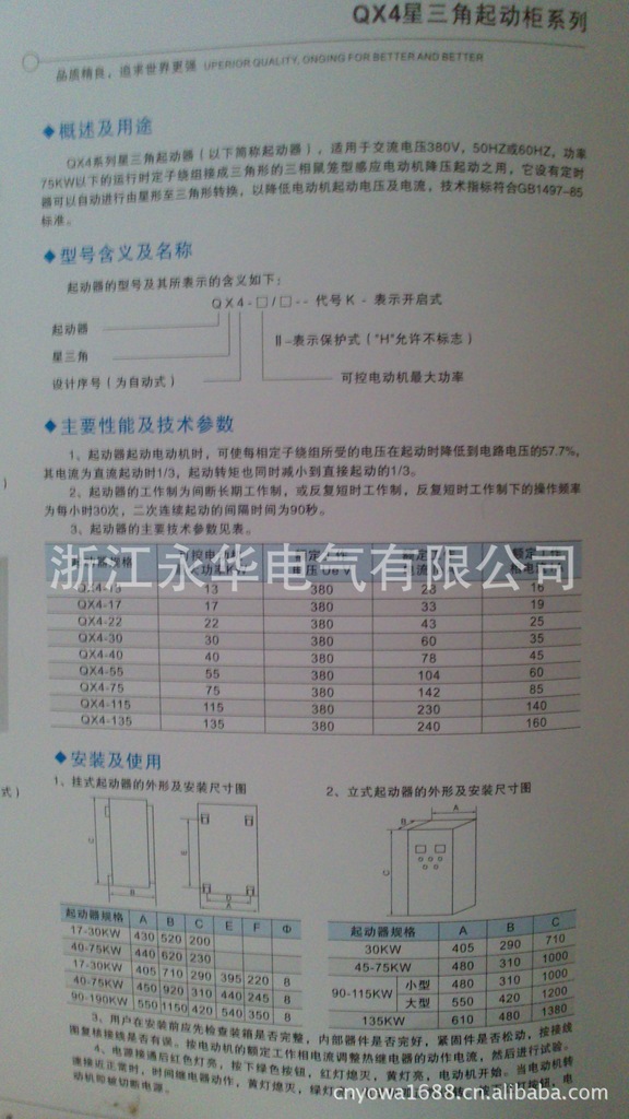 QX4系列星三角起动器(以下简称起动器),适用于交流电压380V,50HZ或60HZ,功率75KW以下的运行时定子绕组接成三角形的三相鼠笼型感应电动机降压起动之用,它设有定时器可以自动进行由星形至三角形转换,以降压电动机起动电压及电流,技术指标符合GB1497-85标准。