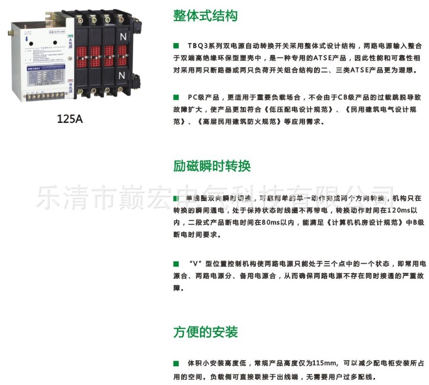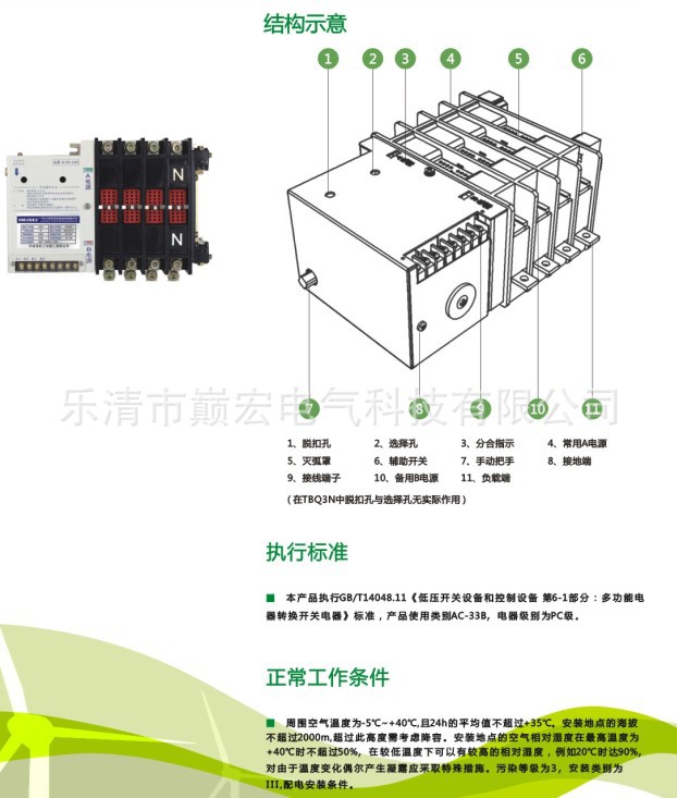 产品广泛应用于消防、医院、银行、高层建筑等不允许断电的重要供电场所的输、配电系统及自动化系统。自动转换开关符合:GB14048.3-2008《低压开关设备和控制设备第3部分:开关、隔离器、隔离开关以及熔断器组合电器》,GB/T14048.11-2008《低压开关设备和控制设备多功》。