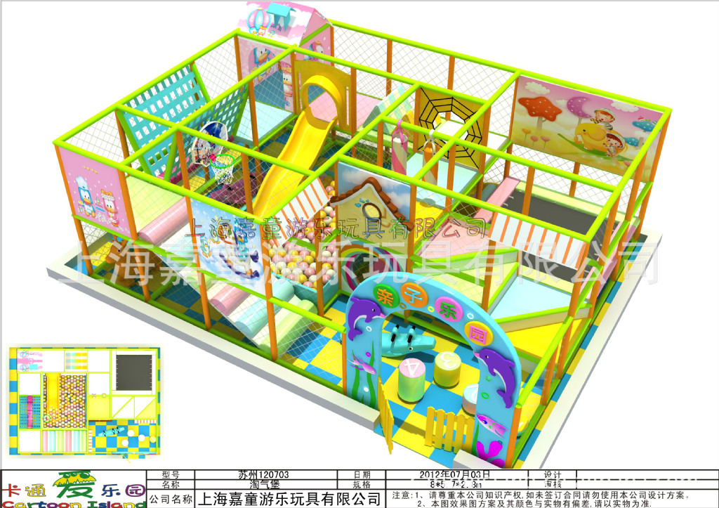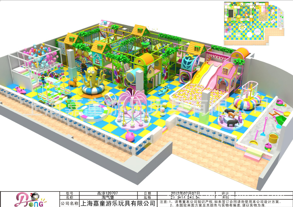 1. 淘气堡具体要根据场地设计方案,要需求方提供场地平面图(尽可能的提供详细的尺寸,包括场地长宽高、场地中有没柱子,如果有的话得有柱子大小、柱子到旁边的距离,还有就是从哪个位置进出儿童乐园,周围有无消防栓等等这些数据得在平面图上标明)