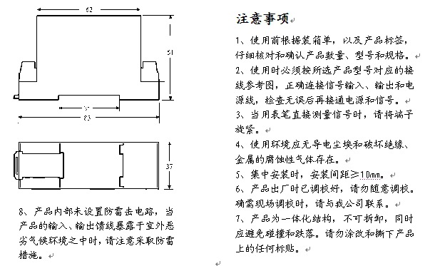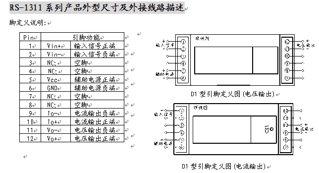 概述 RS-诺顺1311交流电流信号隔离变送器采用先进的磁隔离技术,能够对交流电压信号进行隔离检/监测,产品体积小,功耗低,精度高。有单相,三相三线和三相四线制多种。RS-诺顺1311交流电流信号隔离变送器输入、输出和辅助电源之间可以承受2500VDC隔离耐压,多路产品的所有输出都相互隔离,可以灵活应用。RS-诺顺1311交流电流信号隔离变送器广泛用于电力、化工、石油、工业和自动控制等领域。 型号说明 RS-1311-**D1-0.5/xxVAC RS----产品品牌标记 1312----交流电孑产品类别序号 第一个“*”----输出代码 1:4~20mA 2:0~20mA 3: 0~5V 4: 0~10V 第二个“*”----辅助电源代码 1:+5VDC 2:+12VDC 3:+15VDC 4:+24VDC 0.5----精度等级0.5% xxVAC----输入信号额定电压值 产品选型举例 输入: 0~220VAC 输出: 4~20mA 辅助电源: +24VDC 产品型号: RS-1311-14D1-0.5/0~220VA