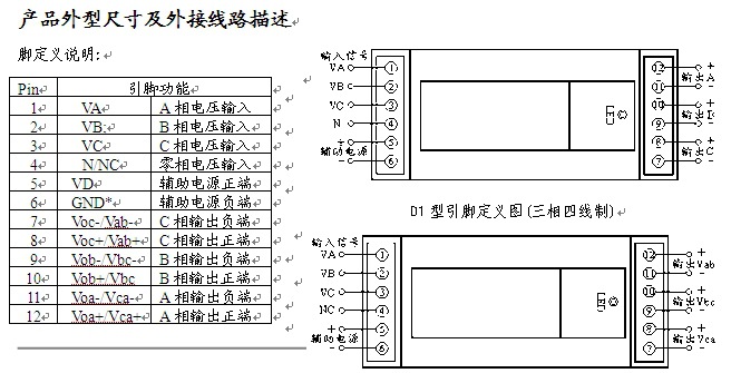 概述 RS-诺顺1331三相交流信号隔离变送器可以对三路交流电压直接进行测量,输入为三相三(四)线制交流电压,被测信号范围为0~10~400VAC,输出信号可以是标准的电流信号或电压信号,也可以按用户要求订制,三组输出信号是完全独立的,用户可以共地或不共地使用;辅助电源可以是+5V、+12V、+15V和+24V;RS-诺顺1331三相交流信号隔离变送器采用DIN35国际标准安装方式;体积小、可靠性高、外形美观、单电源、可以直接使用,方便灵活。可以广泛用于电力、通讯、工业控制、安防工程、自动控制、化工、石油、电镀扥领域。 型号及定义 RS-1331-**D1-0.5/xxVAC RS-1331:导轨式三相三线制交流电压隔离变送器主型号 RS-1341:导轨式三相四线制交流电压隔离变送器主型号 第一个“*”----输出代码 1:4~20mA 2:0~20mA 3:0~5V 4:0~10V 第二个“*”----辅助电源代码 1:+5VDC 2:+12VDC 3:+15VDC 4:+24VDC D1:外壳代码 0.5; 精度等级5% xxVAC:输入电压值 产品选型举例 输入: 0~220VAC 输出: 4~20mA 辅助电源:+24VDC 三相三线制 产品型号:RS-1331-14D1-0.5/0~220VAC
