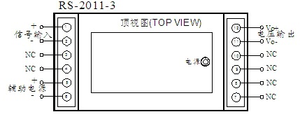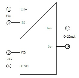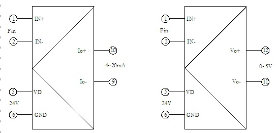 (0~5V或0~10V输出接线图) 引脚描述及外形尺寸: (1)产品引脚描述: 端子 | 1 | 2 | 3 | 4 | 5 | 6 | 7 | 8 | 9 | 10 | 11 | 12 | 描述 | 信号 输入 | 信号 输入 | 空 脚 | 空 脚 | 辅助 电源 | 辅助 电源 | 空 脚 | 空 脚 | 电流 输出 | 电流 输出 | 电压 输出 | 电压 输出 | 符号 | Fin+ | GND | NC | NC | VD | GND | NC | NC | Io- | Io+ | Vo- | Vo+ |
