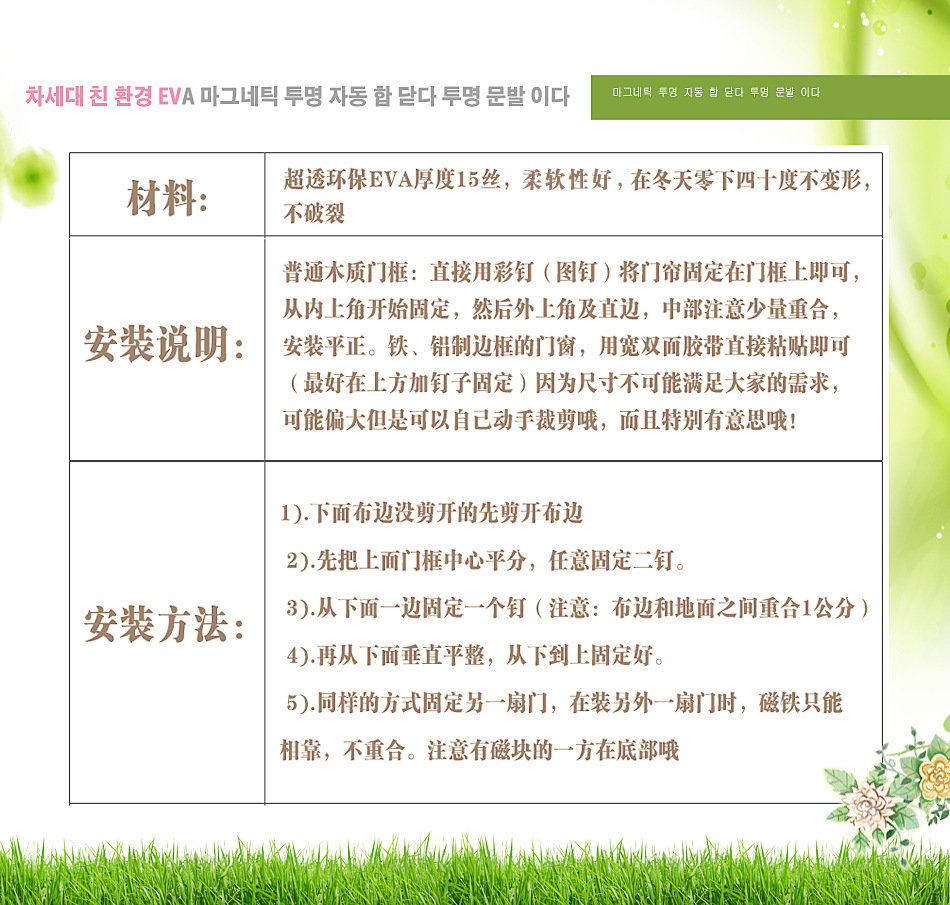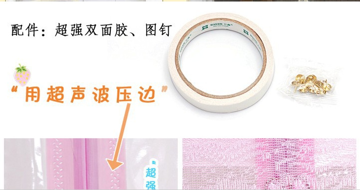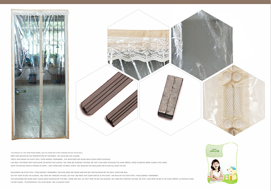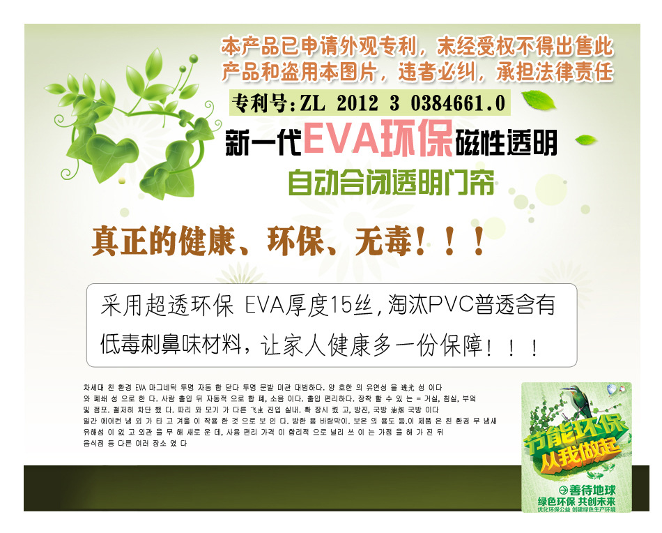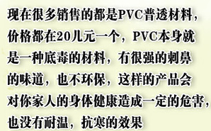 本产品直销几年来都出韩国,受客人喜欢,采用现代工艺超声波压烫法,有装饰扣,外形比一代更漂亮,拿回家一挂就好用.采用环保EVA超透材料,无毒。无气味。可以耐寒在零下40度,不坡破裂。耐高温.