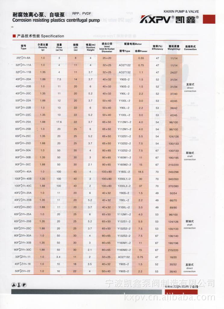 我厂专业生产PVDF、FRPP两种材质四个系列(FV、FP、FVZ、FPZ)的全塑耐腐蚀自吸泵、离心泵、真空泵、喷射泵,其中PVDF泵适合用于强酸、强氧化剂、卤素、脂肪、氯化溶剂等化学介质,使用温度为-40℃~140℃;FRPP泵适用于强碱及一般酸碱盐类及其衍生物,使用温度为-14℃~+90℃。泵的传动一般供二极Y型节能机电,由用户提出:对流量、扬程、转速、功率如有特殊要求,我厂可以提供技术服务,满足用户要求。