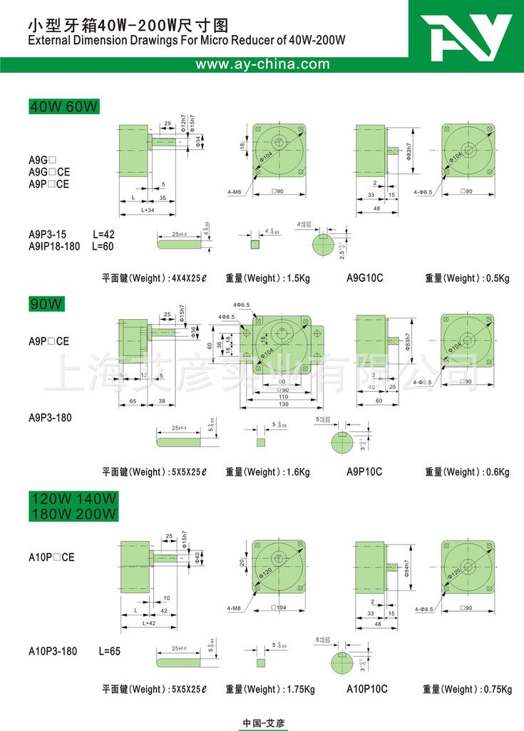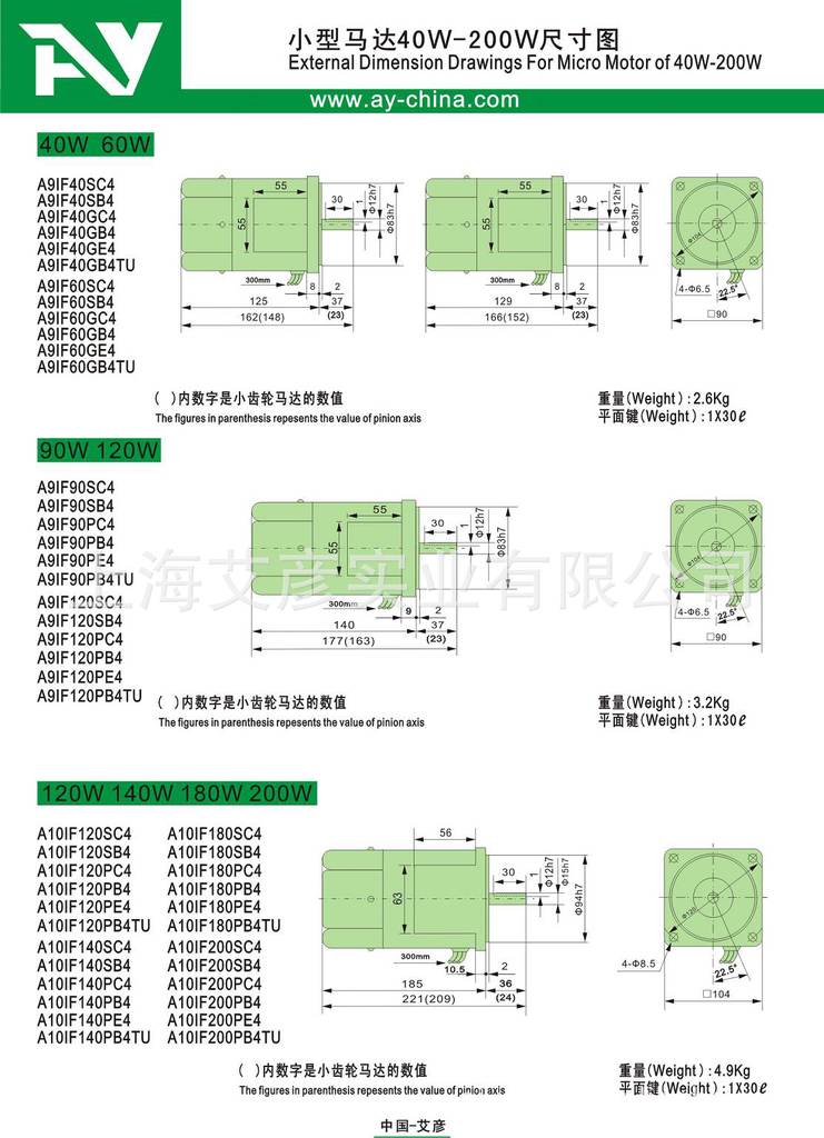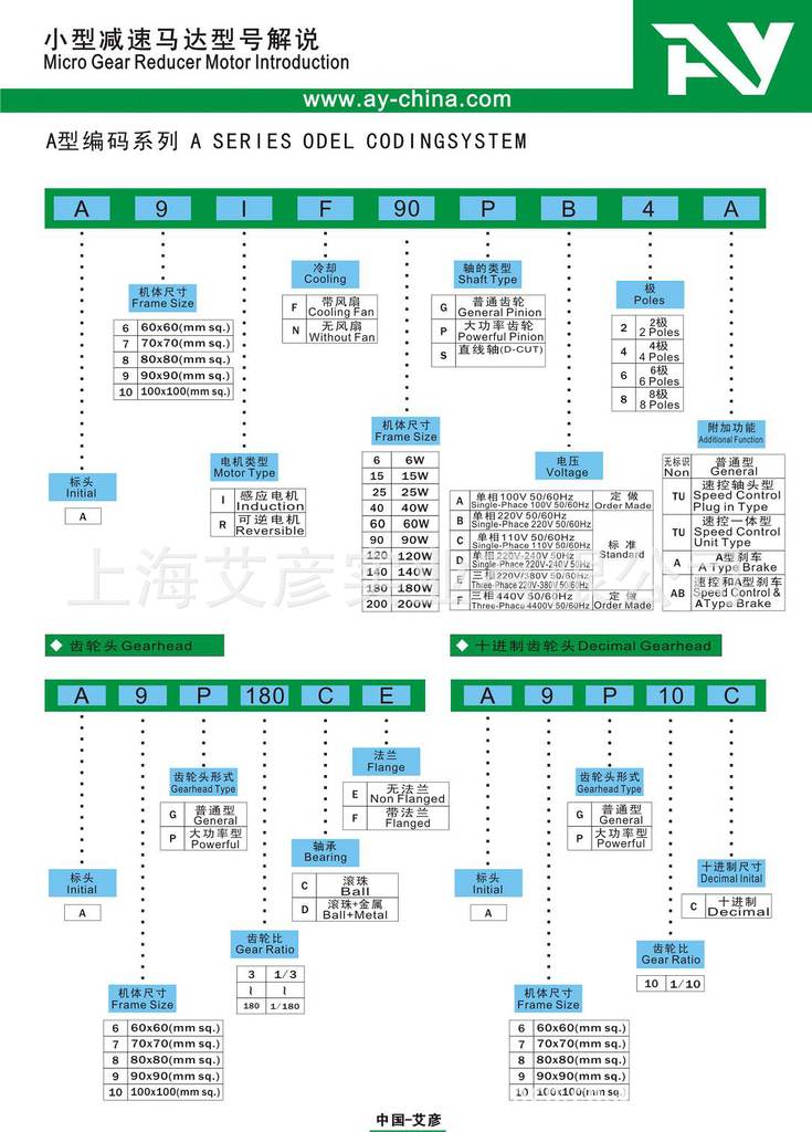 Korea AY motor (A) series specification complete power 6 W-200 W, ratio 1:3/1:18 00, our products mainly used in all kinds of low speed running mechanical, handling machinery and packaging machinery, food machinery, printing machinery, mechanical transmission, pharmaceutical machinery, advertising equipment, electronic equipment, sewage treatment equipment, industrial and mining equipment, etc. The products have passed China compulsory product certification (3 C authentication), the European Union CE, ISO9001:2000 quality system authentication.