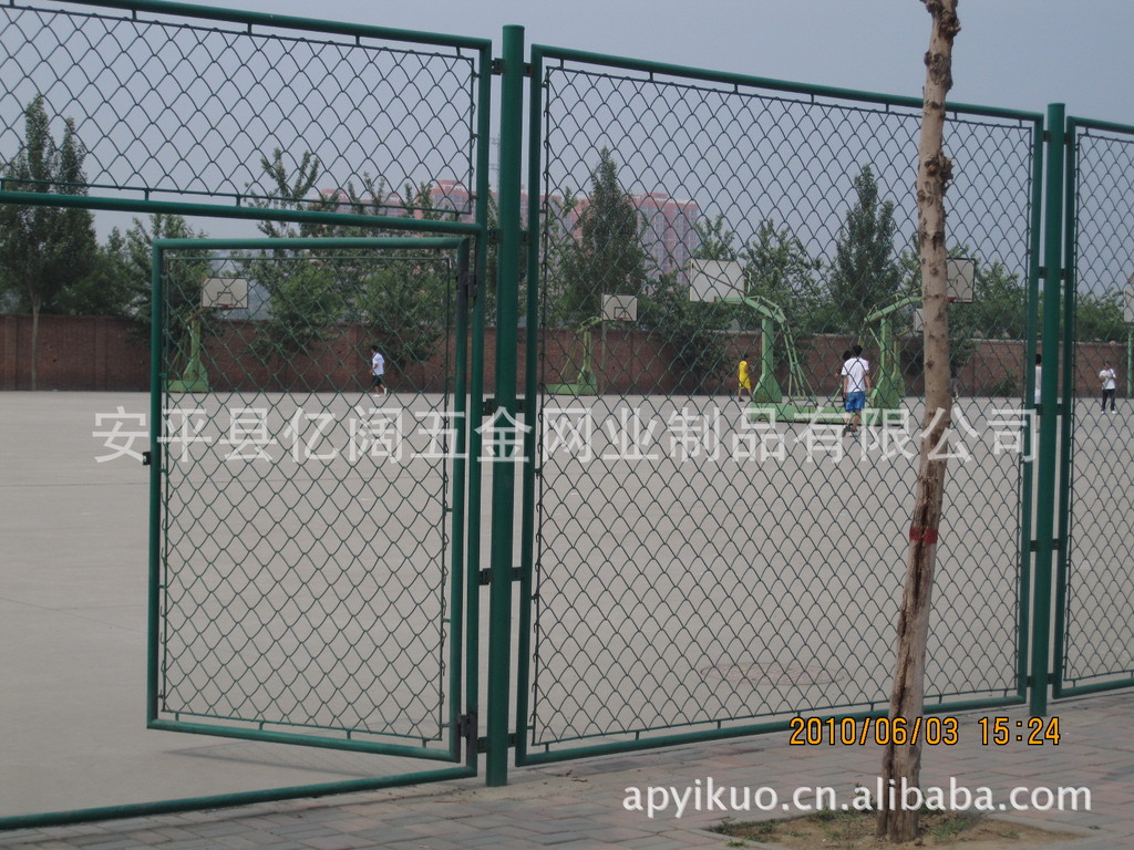 2、通道门应足够大,以便维护球场的设备进入。通道门应置于适当的位置,以免影响打球。一般门宽2米、高2米或宽1米、高2米。 3、围网最好采用包塑的铁丝网,网眼最大面积应为50毫米X50毫米(45毫米X45毫米),围网的固定零件不能有锐利的边沿。