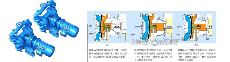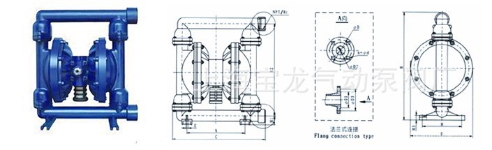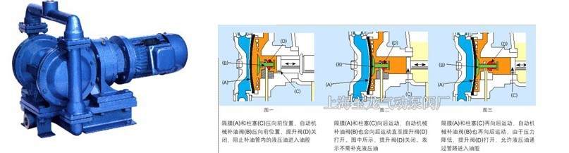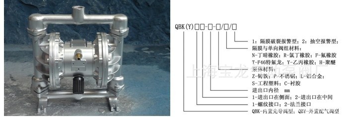 一、产品概述: 宝龙生产的DBY型一体式电动隔膜泵是一种新型的泵种,近年来,由于在隔膜材料取得了突破性的进展,国际上越来越多的工业化国家要用此种型式的泵,代替部份离心泵、螺杆泵,来应用于石化、陶瓷、冶金等行业。我单位目前生产的隔膜泵分为YGB液动式和DBY电动式,产品设计均参考美国ABEL公司样机DBY型隔膜泵适用于低压,即出口压力≤3kgf/cm2的场合,YGB型适用于出口压力≥4kgf/cm2的场合。 二、主要特点: 1、不需灌引水,自动能力达4米以上。 2、通过性能好,直径在10毫米以下的颗粒、泥浆等均可以毫不费力地通过。 3、由于隔膜将被输送介质和传动机械件分开,所以介质绝对不会向外泄漏。且泵本身无轴封,使用寿命大大延长。根据不同介质,隔膜分为氯丁橡胶、氟橡胶、丁晴橡胶等,可以满足不同用户的要求。 4、泵体介质流经部份,可根据用户要求,分为铸铁、不锈钢、衬胶,电机分为普通式和防爆式(B3b)两种。 三、型号意义:
