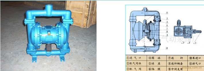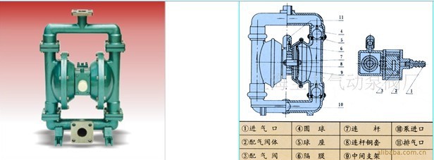 四、使用范围: 1、各种剧毒、易燃、易挥发液体。 2、各种强酸、强碱、强腐蚀性液体。 3、可输送较高温度的介质120℃。 4、作为各种压滤机前级送压装置。 5、热水回收及循环。 6、油罐车、油库、油品装卸。 7、泵吸泡菜、果酱、土豆泥、巧克力等。 8、泵吸油漆、树胶、颜料粘合剂。 9、各种橡胶、浆乳胶、有机溶剂、填料。 10、用泵为油轮驳船清仓吸取仓内污水及剩油。 11、啤酒花及发酵粉稀浆、糖浆、精密。 12、泵吸矿井、坑道、隧道、下水道中污水、沉淀物。 13、各种特殊介质的吸送。 五、结构说明:  | 电机与减速机(3)通过轴承箱(1)带动曲轴(2)旋转,由变向机构(4)将同轴端的圆周运动转变成滑动杆(5)的轴向移动,再带动隔膜往复运动。在左右两个泵腔内,装有上下四个单向球阀、隔膜的运动造成工作腔的容积的改变,迫使四个单向球阀交替地开启和关闭,从而将液体不断地吸入和排出。 |