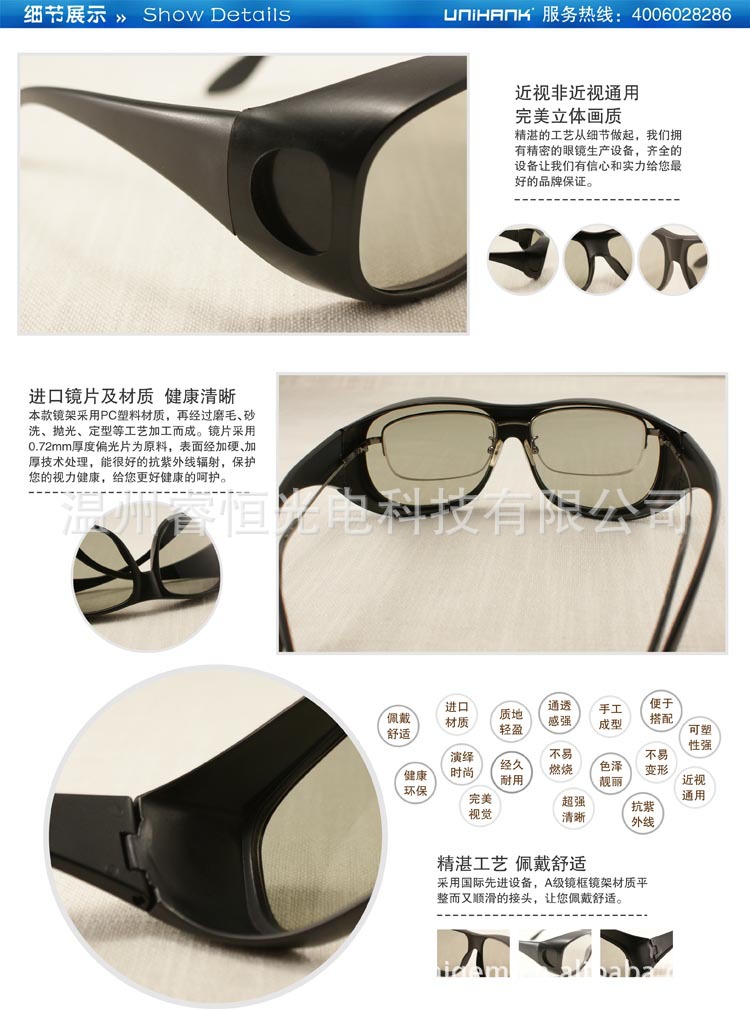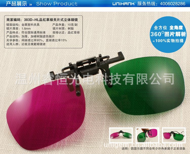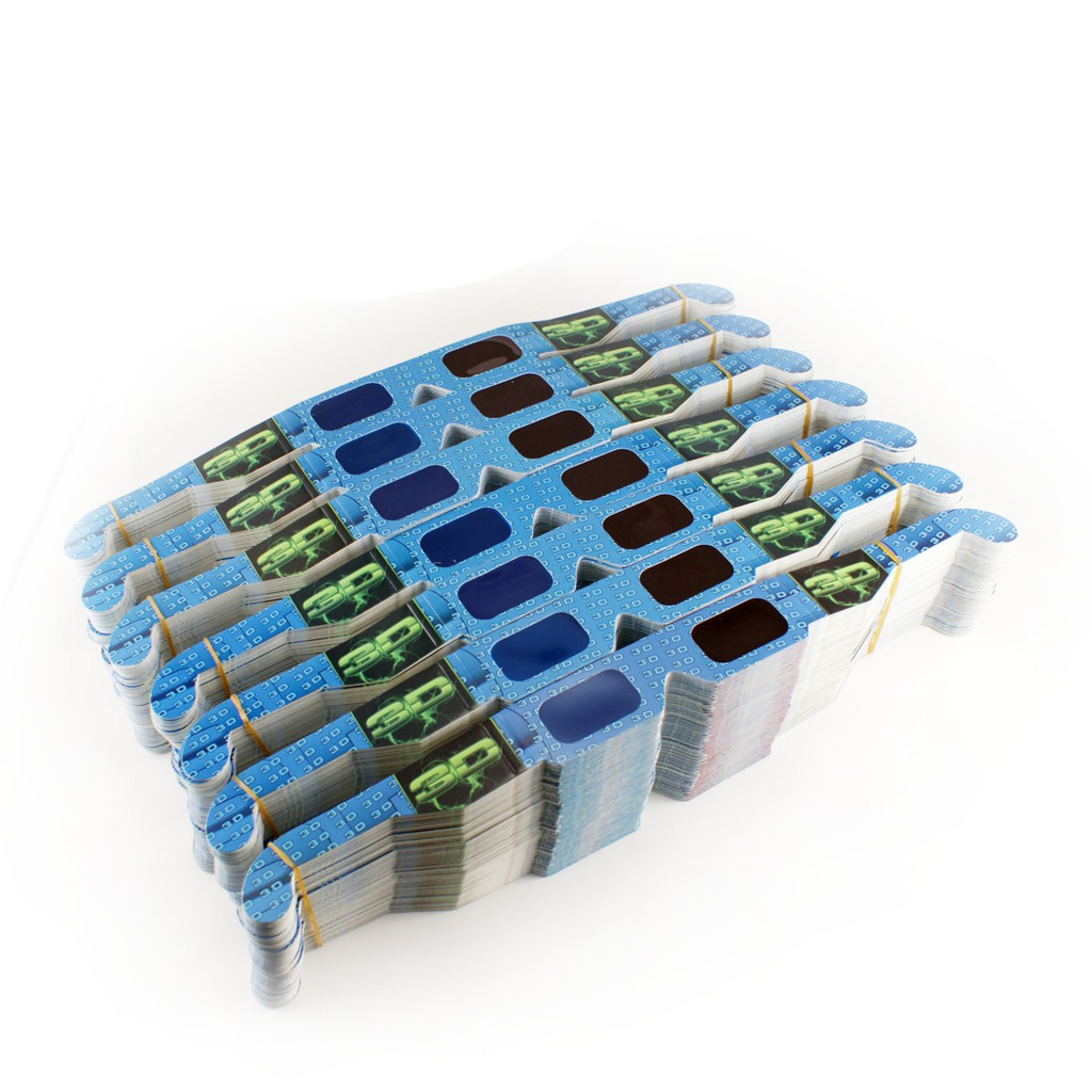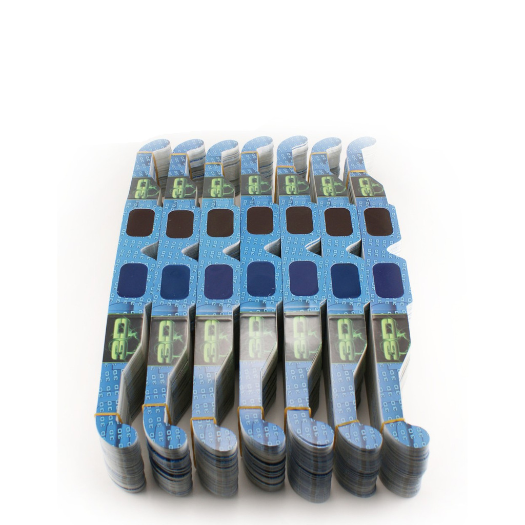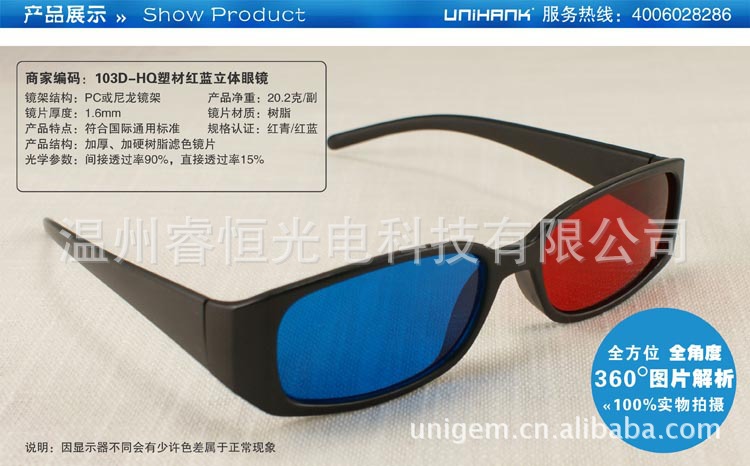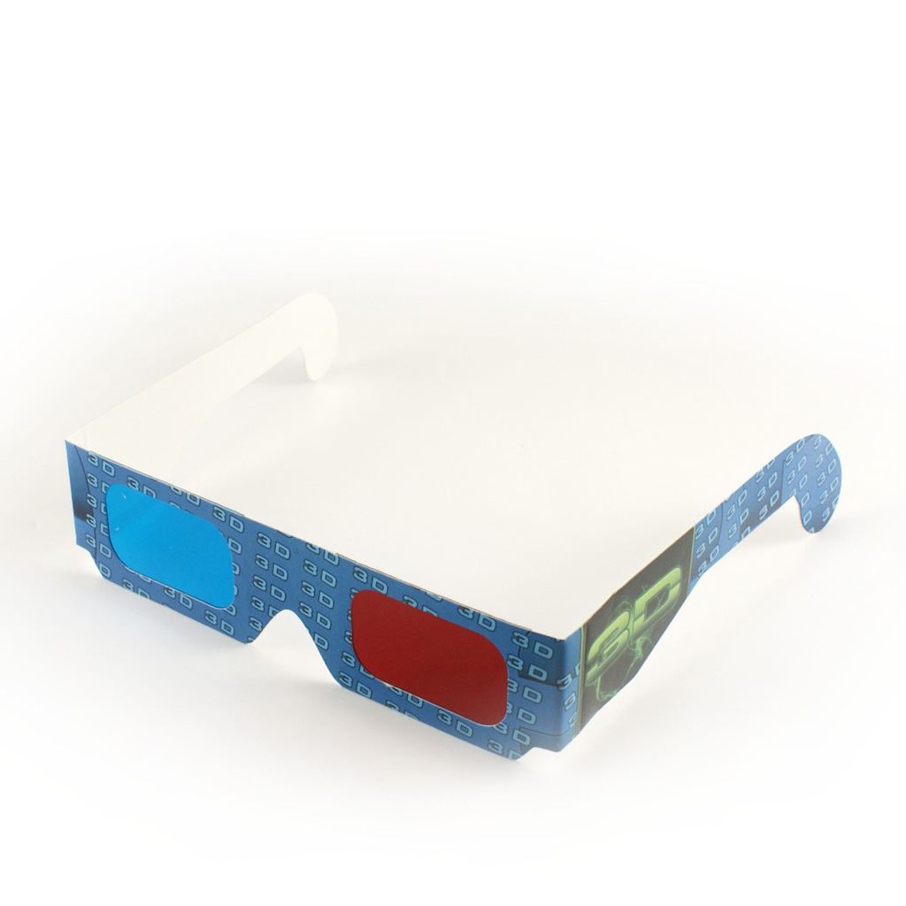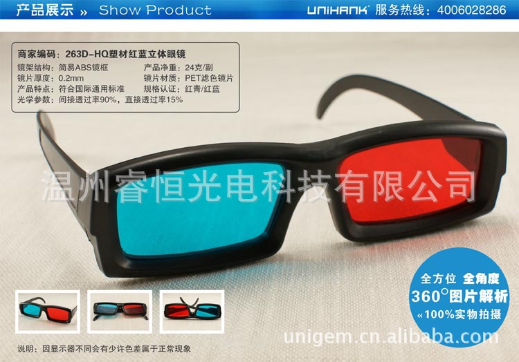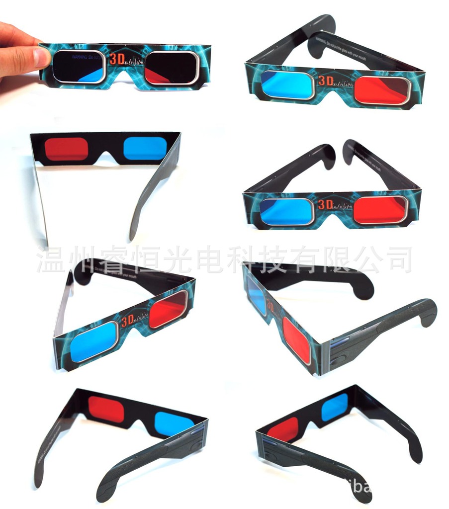250克四色彩印单铜纸对裱,0.2MM PET过滤色片.特定原理装配,色彩,图文,外形可随客户需求制做.纸材红青眼镜广泛应用于立体图书,立体剧场等大众场所,为一次性使用工具.适用范围:3D影视教材,科教医疗3D器材,3D影院,家庭3D电视,3D电脑游戏,3D图书.3D报纸.3D立体副,3D立体广告等