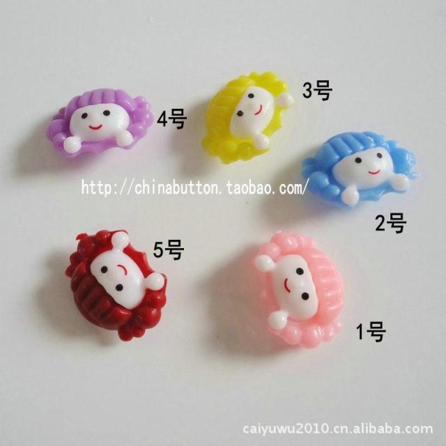 【品名】:双拼娃娃脸卡通扣【规格】:23*17mm【颜色】:多色【材质】:尼龙