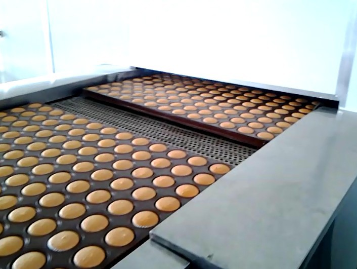 蛋糕生产线主要流程:原料搅拌→自动送料→模具喷油刷油(放纸托)→注浆成型→烘烤→冷却→(注心)→脱模→杀菌→回盘→清盘
