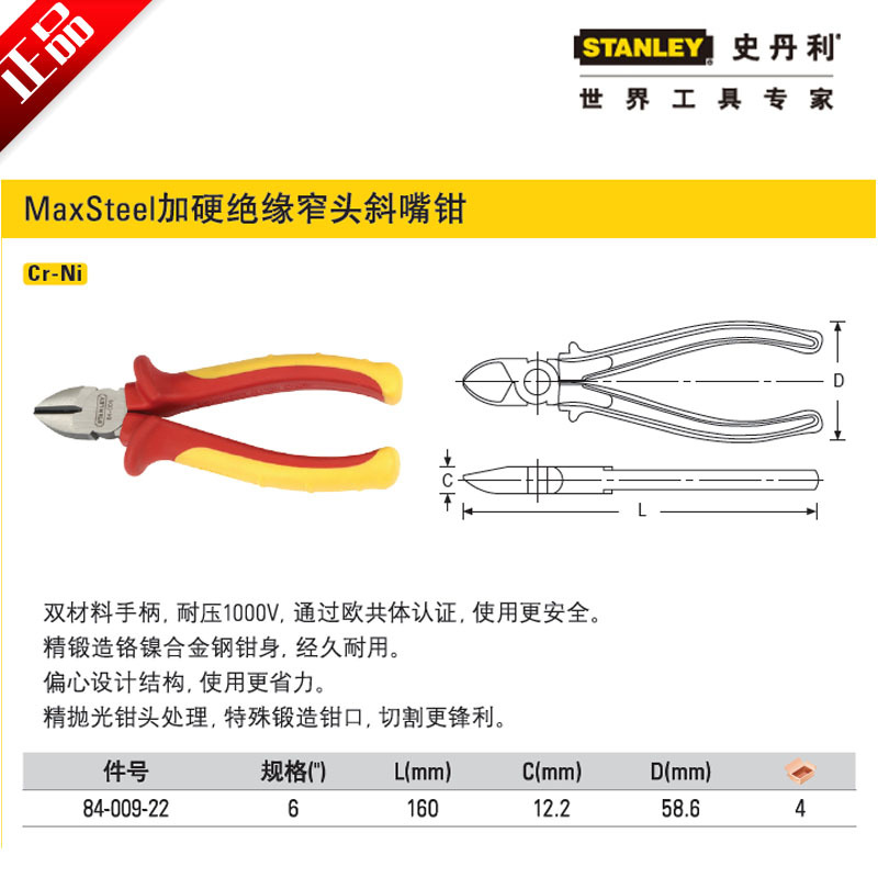 史丹利 加硬绝缘窄头斜嘴钳子 精抛光 耐压 手动钳子 84-009-22