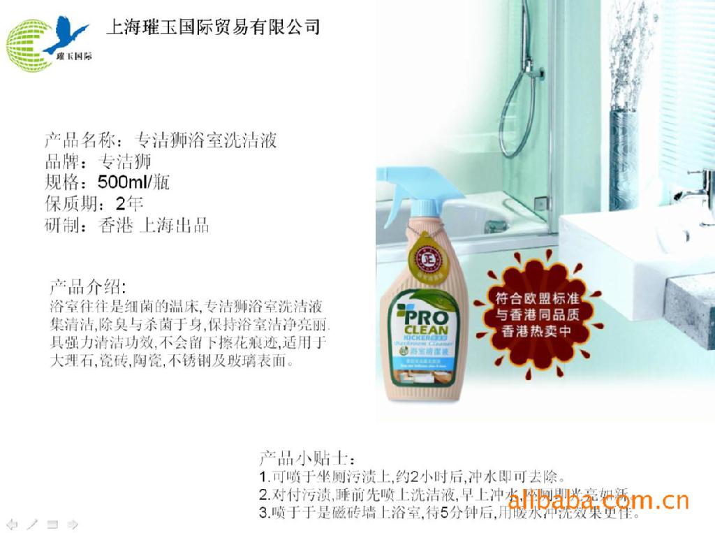 环保浴室清洁液,具有强力清洁效果,专门针对浴室污渍,效果显著。温和洁净配方,不会留下擦花痕迹。适用于大理石,瓷砖,陶瓷,不锈钢及玻璃表面。