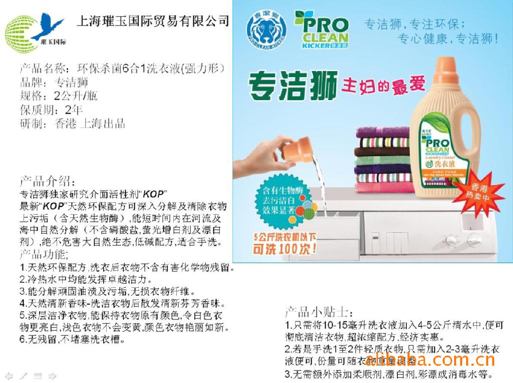 环保预洁洗衣液,含专洁狮独家研发“KOP”(环保介面活性剂),能在短时间在河流或海洋中分解,不污染环境。使用时不损衣物纤维和原色,保持衣物柔顺,亮丽如新,气味怡人。其低碱配方(PH7.5-8.6)性质温和,呵护双手肌肤。