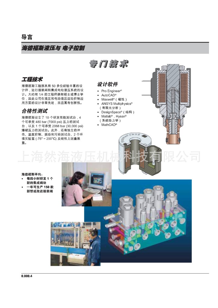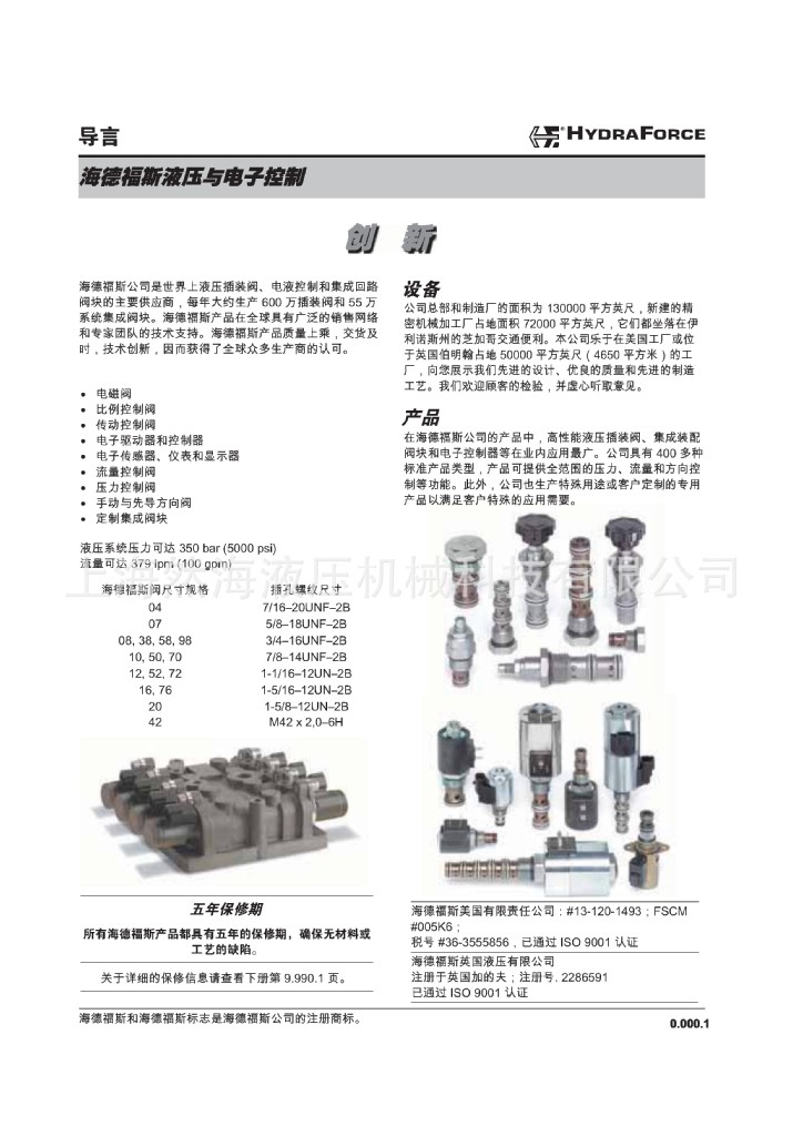 美国HYDRAFORCE(海德福斯)公司创立于1985年,总部及主要生产基地设立在美国的芝加哥,在英国的伯明翰另设有研发及生产基地。全球拥有120多个授权经销商。作为行业领先的跨国公司,通过了QS9000和ISO9001的质量认证.现产品广泛应用在农用/草场机械工程建设/道路机械,注塑机及废物处理等移动机械设备和工业制造行业。HYDRAFORCE采用的CAD以及CAM工艺设计系统使其产品得以不断更新,并且能与其他品牌的插装阀很方便地替换,深受广大客户的欢迎。其产品被广泛应用于机械、车辆、传动及传动控制系统。