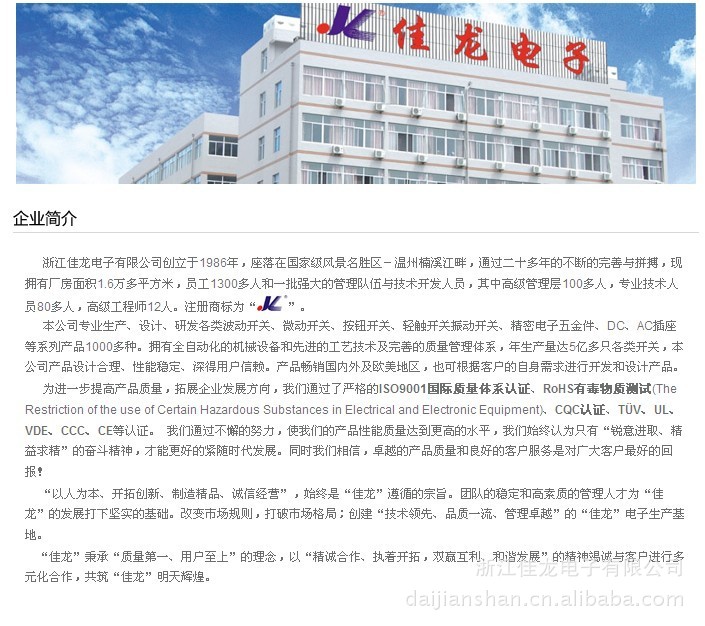浙江佳龙电子有限公司座落在国家级风景名胜区-温州楠溪江畔,创立于一九八六年。厂房面积1.2万多平方米。拥有员工1000多人,管理人员70多人,专业技术人员40多人。公司在2001年顺利通过ISO9001国际质量体系认证。 本公司专业生产和开发各类拨动开关、船形开关、轻触开关、按钮开关、叶片开关、振动开关、精密电子五金件、DC,AC插座等系列产品600多种