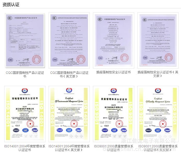为进一步提高产品质量,拓展企业发展方向,我们通过了严格的ISO9001国际质量体系认证、RoHS有毒物质测试(The Restriction of the use of Certain Hazardous Substances in Electrical and Electronic Equipment)、CQC认证、TÜV、UL、VDE、CCC、CE等认证。 我们通过不懈的努力,使我们的产品性能质量达到更高的水平,我们始终认为只有“锐意进取、精益求精”的奋斗精神,才能更好的紧随时代发展。同时我们相信,卓越的产品质量和良好的客户服务是对广大客户最好的回报!