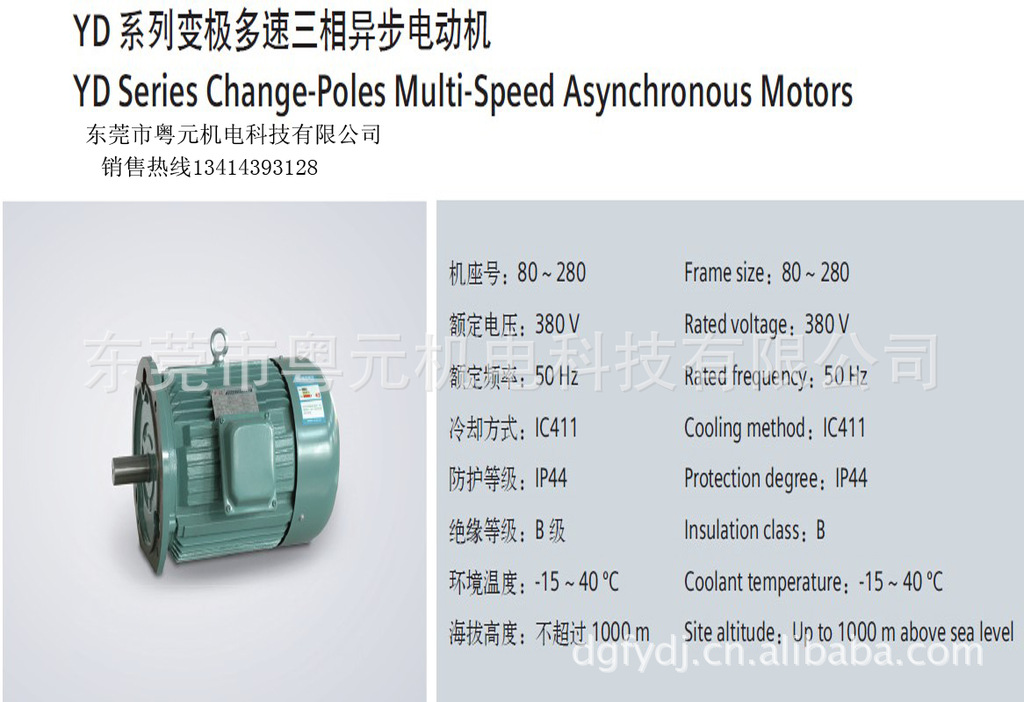 YD系列变极多速三相异步电动机,外形及安装尺寸、绝缘等级、防护等级、冷却方法、结构及安装型式、使用条件、额定电压、额定频率等与Y系列(IP44)电动机相同,适用于需要逐级调速的各种传动结构。在海拔不超过1000m,环境空气温度不超过40℃时,电动机能额定运行。