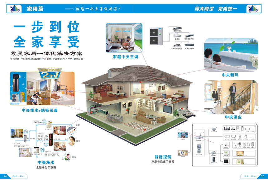 安全、灯光窗帘控制、家电控制、中央空调控制、中央供暖控制、中央换新风控制、家庭影院、背景音 乐等功能一应俱全,并且很好的融合在一起;
