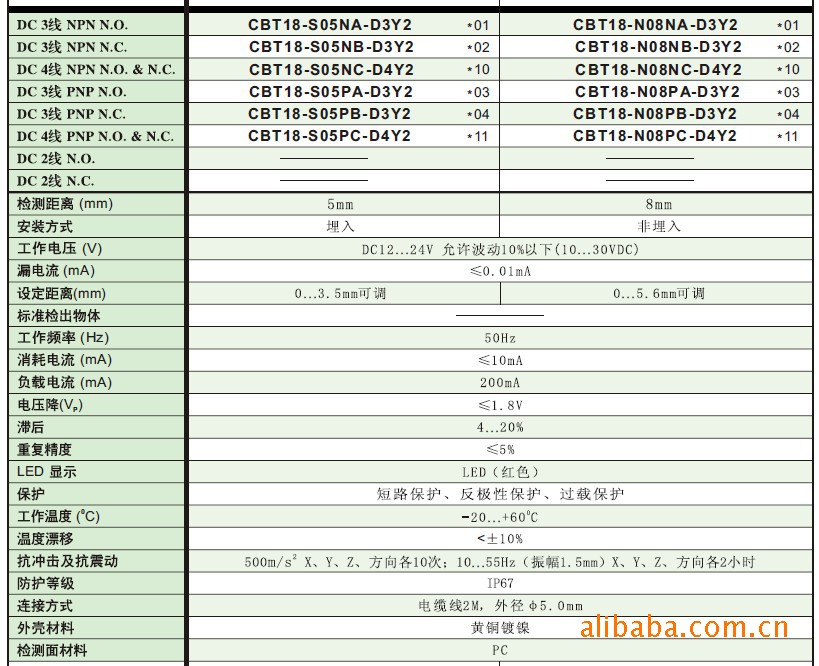 | 型号 | 电压 | 检测距离 | 线数 | N/P型 | 尺寸 |