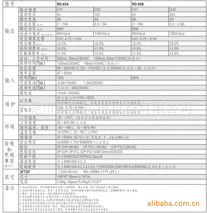 RD-85B | 5V, 0.3~8.0A 24V, 0.2~3.0A | ±2% +4%, -6%% | 80mV 150mV | 78% | 88W |