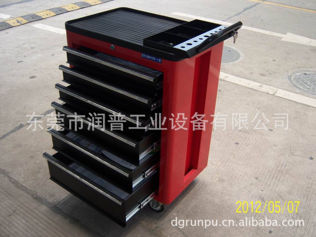 为上下结构,上层三抽屉结构,采用一把锁锁定全部抽屉,配置自走式抽屉滑轨,上部配置标准件盒,两侧配置侧斗,可存放油壶或废纸物等,环保清洁。下层是底盘,供维修时存放拆装部件,存取方便。下部配有万向刹车装置车轮,任意定位,操作灵活,使用方便。