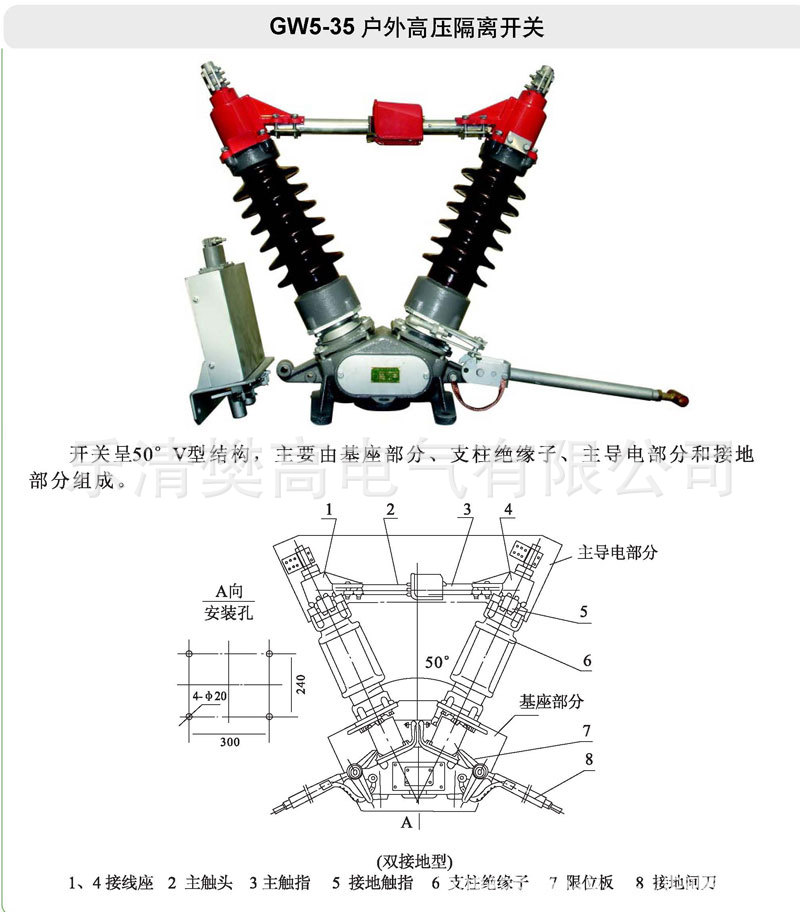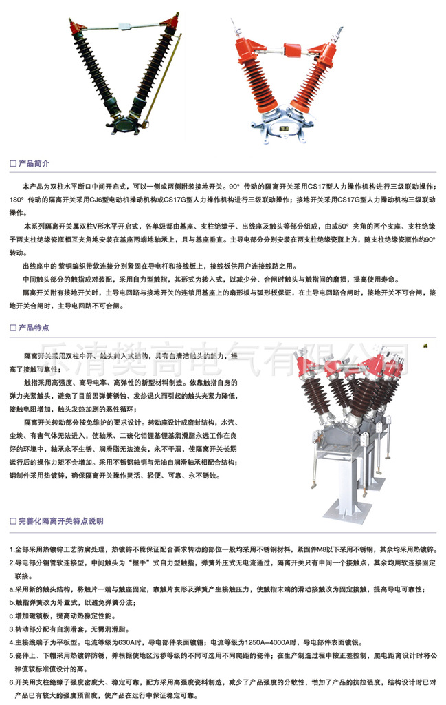GW5-40.5型隔离开关是供高压线路在无载流情况下,进行切换线路以及对被检修的电气设备进行电气隔离的三极户外高压电器,产品性能满足GB1985《交流高压隔离开关和接地开关》及IEC-129(1984)标准要求。该型隔离开关为双柱式V型结构,自清洗效果好,防湿闪能力强,底座安装占地小,可正装,侧装,倒装.