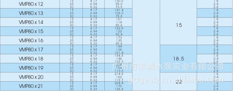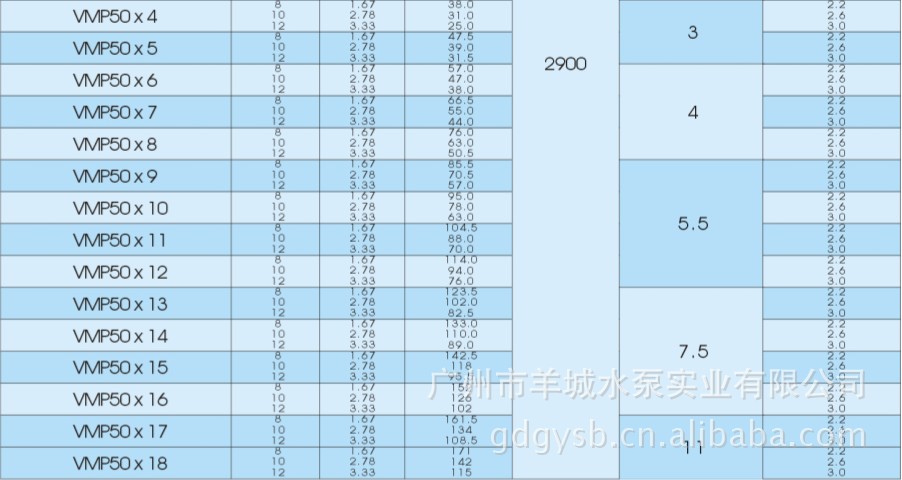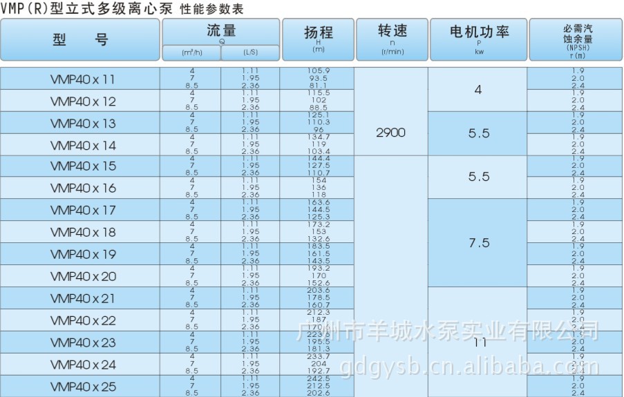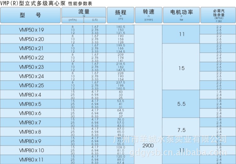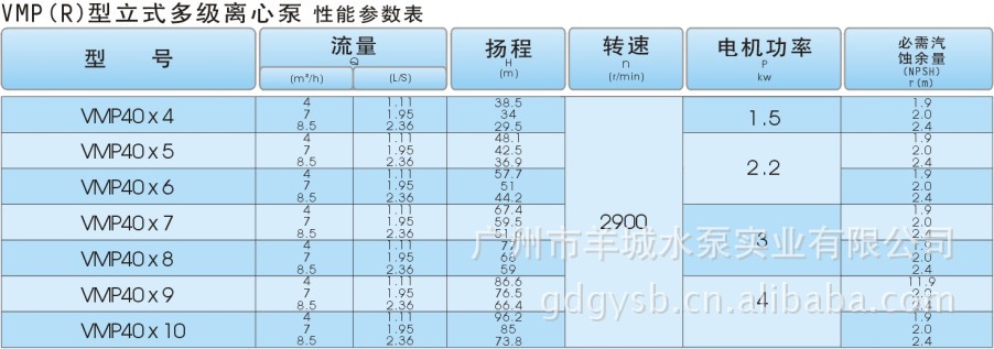 产品名称:VMP(R)型立式多级离心泵|立式多级系列高压热水泵|耐温水泵:一、产品特点:1、具有结构紧凑合理,安装占地面积少,重量轻,运行平稳;2、容易维护保养的各项性能指标,特别设计的机械密封;3、可防止被输送液体的泄漏;4、VMP型立式多级离心泵可输送温度不高于80度的淡水和海水;5、高于80度小于130度可选用VMPR热水型。二、产品用途:1、VMP型立式多级离心泵适用于消防、制冷系统和工业、农业、高楼、旅馆、深井抽水、淡水和海水的输送;2、VMPR型立式多级离心泵热水型输送温度不高于130度,适用于采暖、浴室、冷热水循环。三、型号意义【例:VMPR40*10】:VMP—立式多级离心泵;R—热水型;40—吸入、排出口径(mm); 10—级数为10级.四、注意事项: 1、在泵与电机联接时,一定要将泵轴向上提起1-2mm ,然后再拧紧联轴器是的螺栓;2、泵在起动前一定在用手转动泵转子,感觉灵活;3、泵在起动前必需让泵内充满水(泵出水段的螺塞有水喷出为止),然后关闭出口闸阀和压力表,真空表旋塞;4、注意经常检查泵联轴器下部的压盖是否有水漏出,正常情况下是应该不泄漏或只有微量的液体存在于盖内,如有较大的泄漏,就应该调整或更换盖内的机械密封;5、检修VMP:水泵在工作1000小时后,应进行检修。叶轮与密封环的半径间隙因磨损超过0.5mm,就应及时更换密封环(机械密封、铜水叶、轴套应每年更换一次)。6、停止运行VMP(R)型立式多级离心泵:慢慢关闭出口闸阀和压力表,真空旋塞,然后关闭电动机。如果所处环境温度较低时,则应放出泵内的水,以免冻裂 。长期停止使用时,应将泵拆开,擦干零件的水,并在滑动面涂以防锈油妥善保存。售后服务为确保用户放心,正常使用本公司产品,特制定以下细则做为本公司的售后服务承诺:一、本公司所生产的产品均达到严格的企业标准和国家机械部标准。二、本公司接到定单通知后,严格按照合同条款的有关规定进行发货,保证产品完好无损,按要求的时间,地点送到。三、在保修期内,产品确因质量问题而引起损坏或不正常工作,本公司负责免费修理或调换,并提供有关的保养维修知识;如因用户使用不当或在保修期外,而引起坏损或不正常工作,本公司对产品提供终身维修服务。四、用户在使用本公司产品的过程当中所出现的问题或信息,请及时反馈本公司,以便本公司及时予以处理改进和提高。本公司提供优质的售后服务,客户所提问题必须在12小时内给予答复或解决。五、本公司所有产品在收到货起算免费保修一年,易损件(叶轮,机械密密封,六角胶,O型圈)除外。六、质量保修:凡购我公司所有产品,在我公司产品规定条件和环境中正确方法使用下,我公司免费保修一年(易损件、人为损坏、缺相等不属于免费保修范围)。七、货物配送:广东省珠三角区域内用户可免运费,订购量大可由我公司负责送货上门;珠三角区域以外地区,需要快递送货上门的运费由用户自担,客户要求必需送货上门所产生的费用由我公司酌情加收。(与我公司长期合作的物流公司:德邦物流、香港快捷速递、广源物流、孟源物流、城市之星、安捷物流、顺风速运、港中能达等。)八、结算方式:电汇、现金(广东省珠三角区域内用户可实行快递或货运代收款方式交货结算)。九、开票问题:我公司可开普通税和增值税 (普通税税率:8%、增值税税率:17%)。十、包装:在不损坏产品为前提条件下,我公司自行包装,包装材料不限定。(省外以及出口用木箱或特殊包装)十一、货期:从用户下订金次日算起到收货地点(站点)止。十二、退换货问题:从发货之日起算7天内可退换货。--------------------------------------------------------------------------------友情提醒—水泵选型应考虑以下几点:1、介质腐蚀性:含腐蚀性的液体/介质根据腐蚀性的强度选择不锈钢的材质,腐蚀性越高所需不锈钢材质要求就越高。我司目前耐腐蚀材料有304L、316、316L。其中316L耐腐蚀最强。但腐蚀性高于一定浓度时需选择氟塑料泵。2、介质挥发性/介质的易燃性:如若液体/介质含有一定的挥发性或易燃性,电机需要配备防爆装置。3、流量和扬程:流量是选泵的重要性能数据之一,它直接关系到整个装置的的生产能力和输送能力。选择泵时,以最大流量为依据,兼顾正常流量,在没有最大流量时,通常可取正常流量的1.1倍作为最大流量。扬程指从水面到通过水泵接水管后提升的最大高度。选用水泵时,不可忽略,否则,将会抽不上水来。4、选泵时,除以下情况外,应尽可能选用离心泵: A.有计量要求时,宜选用计量泵; B.扬程要求很高,流量很小且无合适小流量高扬程离心泵可选用时,可选用往复泵; C.扬程很低,流量很大时,可选用轴流泵和混流泵; D.介质粘度较大(大于650~1000mm2/s)时,可考虑选用转子泵或往复泵(齿轮泵、螺杆泵); E.介质含气量75%,流量较小且粘度小于37.4mm2/s时,可选用旋涡泵; F.对启动频繁或灌泵不便的场合,应选用具有自吸性能的泵,如自吸式离心泵、自吸式旋涡泵,自吸式排污泵。--------------------------------------------------------------------------------电话(TEL):0769-26384643 13809627263传真(FAX):0769-22176753Q Q:335483315(加QQ时请说明来意,否则会不小心拒绝您)E-Mail:cn556100@163.com--------------------------------------------------------------------------------广州市羊城水泵实业有限公司公司开户银行:广州市广州银行新港中支行名称:广州市羊城水泵实业有