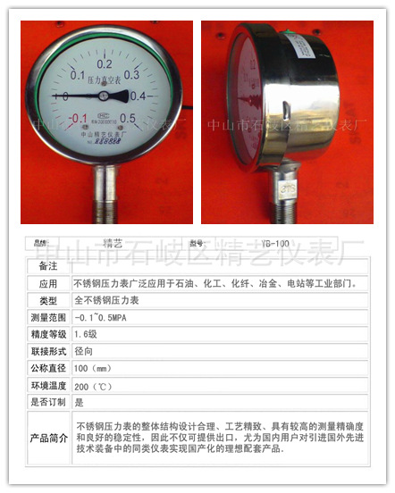 不锈钢压力表的整体结构设计合理、工艺精致、具有较高的测量精确度和良好的稳定性,因此不仅可提供出口,尤为国内用户对引进国外先进技术装备中的同类仪表实现国产化的理想配套产品.