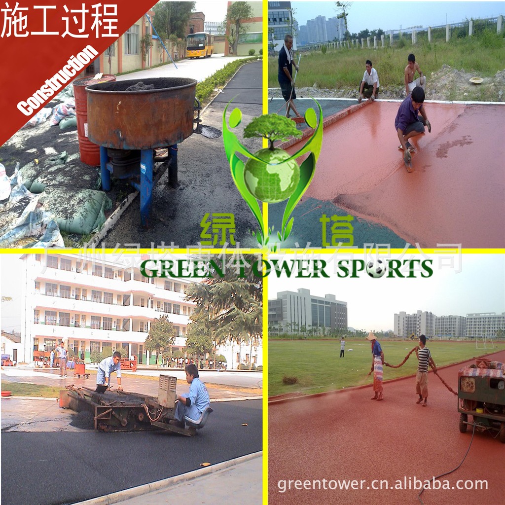 (1)材料:塑胶跑道弹性体是由甲组、乙组按配比组成,其甲组成分主要为进口原料合成的聚氨酯原料,乙组成分为硫化剂、进口色料及多种助剂混合而成。