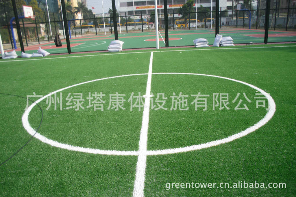 全天侯性:人造草坪完全不受天气、地域的影响,能在高寒、高温、高原等极端气候地区使用,且使用寿命长。 仿真性:人造草坪采用仿生学原理,具有良好的仿真性,使运动者在运动时更安全、舒适。脚感、球感的反弹速度等均与天然草坪相似,更具专业性。 铺设及保养:人造草坪铺设对地基要求低,可以在沥青、水泥上进行施工且周期短。特别适合于训练时间长、使用密度高的中、小学场馆建设。人工草坪保养方便,渗水性能良好,还特别耐磨。 多用途:人造草坪颜色多样,经久耐用不褪色,可以与周围环境及建筑群配套,是运动场馆、休闲庭院、屋顶花园等场所的最佳选择。 优良的物理化学性能:将人造草皮经过几十万次的磨损试验后,其纤维重量仅损失2%-3%。此外,拉力、渗水性、弹性均很高,大雨后40分钟左右就能排水干净。 生产采用多项现代科学技术,使产品抗拉强度、牢固度、柔韧性、耐磨性、抗老化性、色牢度等均达到相当高的水平。 安全性好:运用医学和运动学等原理,使运动者在草坪上运动时,韧带、肌肉、 关节等受到保护,摔倒时的冲撞力和摩擦力大大减少。 平均使用寿命6年以上。 球场的各种划线在生产时已用白色草苗一次成型。