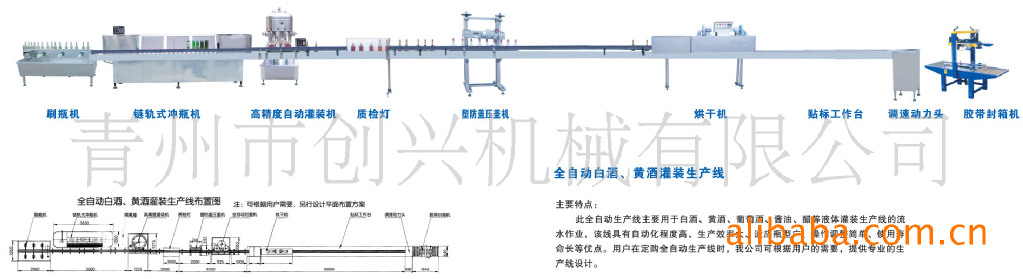 青州市创兴机械有限公司,是专业研制生产液体灌装设备的厂家。公司技术力量雄厚,工艺设备先进,检测仪器齐全,有可靠的质量保证体系。在此基础上,不断开发出技术精良、品质卓越的新产品。潜心研制生产的CGP系列灌装机,是公司主打产品,主要用于由一定浓度的液体灌装,适用于白酒、葡萄酒、酱油、醋、农药的灌装,解决了灌装液体外溢的问题。最新研制的电脑直线系列灌装生产线,是我公司根据用户需求而生产的适应各种瓶型的大容量(1-50升)、高浓度(食用油、老抽酱油、香油、机油、蜂蜜等)液体灌装。该系列机高科技投入,全自动化设计,集光、电、气于一体,灌装精度高,是机械类灌装替代产品。公司严格贯彻“优质产品,星级服务”的经营理念,精心推出了具有国内先进水平的刷瓶机-冲瓶机-灌装机-封盖机-打塞机-烘干机-热缩机-封箱机等自动或半自动灌装生产流水线,用户可根据自己生产能力选择合适的生产线,也可单机使用,该产品赢得客户良好的赞誉。产品远销全国三十多个省市自治区。公司视质量为企业的生命,建有严格的质量保障体系,以“质量求生存、服务赢顾客”为经营理念。衷心希望新老朋友光临我公司指导工作、洽谈业务。青州市创兴机械有限公司,是专业研制生产液体灌装设备的厂家。公司技术力量雄厚,工艺设备先进,检测仪器齐全,有可靠的质量保证体系。在此基础上,不断开发出技术精良、品质卓越的新产品。潜心研制生产的CGP系列灌装机,是公司主打产品,主要用于由一定浓度的液体灌装,适用于白酒、葡萄酒、酱油、醋、农药的灌装,解决了灌装液体外溢的问题。最新研制的电脑直线系列灌装生产线,是我公司根据用户需求而生产的适应各种瓶型的大容量(1-50升)、高浓度(食用油、老抽酱油、香油、机油、蜂蜜等)液体灌装。该系列机高科技投入,全自动化设计,集光、电、气于一体,灌装精度高,是机械类灌装替代产品。公司严格贯彻“优质产品,星级服务”的经营理念,精心推出了具有国内先进水平的刷瓶机-冲瓶机-灌装机-封盖机-打塞机-烘干机-热缩机-封箱机等自动或半自动灌装生产流水线,用户可根据自己生产能力选择合适的生产线,也可单机使用,该产品赢得客户良好的赞誉。产品远销全国三十多个省市自治区。公司视质量为企业的生命,建有严格的质量保障体系,以“质量求生存、服务赢顾客”为经营理念。衷心希望新老朋友光临我公司指导工作、洽谈业务。青州市创兴机械有限公司,是专业研制生产液体灌装设备的厂家。公司技术力量雄厚,工艺设备先进,检测仪器齐全,有可靠的质量保证体系。在此基础上,不断开发出技术精良、品质卓越的新产品。潜心研制生产的CGP系列灌装机,是公司主打产品,主要用于由一定浓度的液体灌装,适用于白酒、葡萄酒、酱油、醋、农药的灌装,解决了灌装液体外溢的问题。最新研制的电脑直线系列灌装生产线,是我公司根据用户需求而生产的适应各种瓶型的大容量(1-50升)、高浓度(食用油、老抽酱油、香油、机油、蜂蜜等)液体灌装。该系列机高科技投入,全自动化设计,集光、电、气于一体,灌装精度高,是机械类灌装替代产品。公司严格贯彻“优质产品,星级服务”的经营理念,精心推出了具有国内先进水平的刷瓶机-冲瓶机-灌装机-封盖机-打塞机-烘干机-热缩机-封箱机等自动或半自动灌装生产流水线,用户可根据自己生产能力选择合适的生产线,也可单机使用,该产品赢得客户良好的赞誉。产品远销全国三十多个省市自治区。公司视质量为企业的生命,建有严格的质量保障体系,以“质量求生存、服务赢顾客”为经营理念。衷心希望新老朋友光临我公司指导工作、洽谈业务。