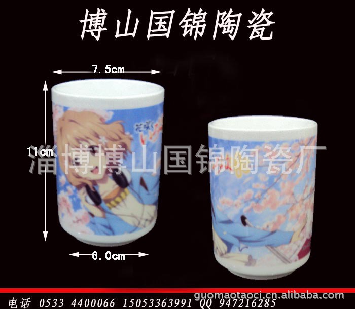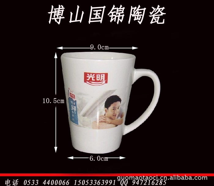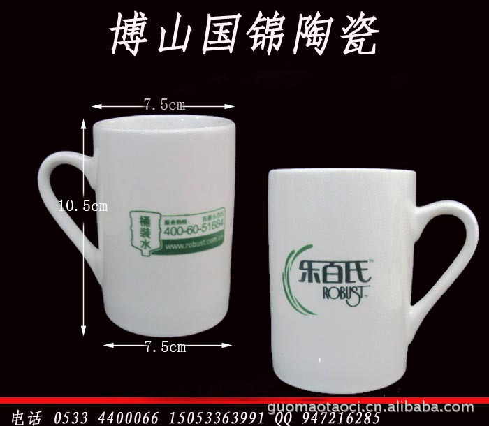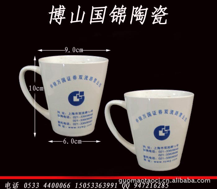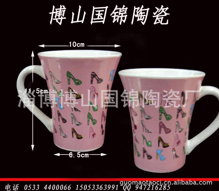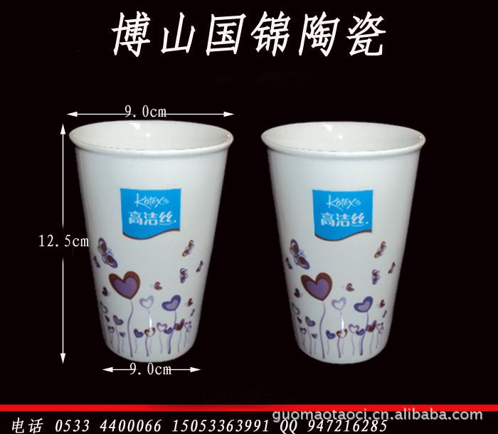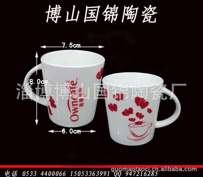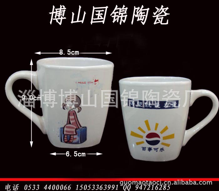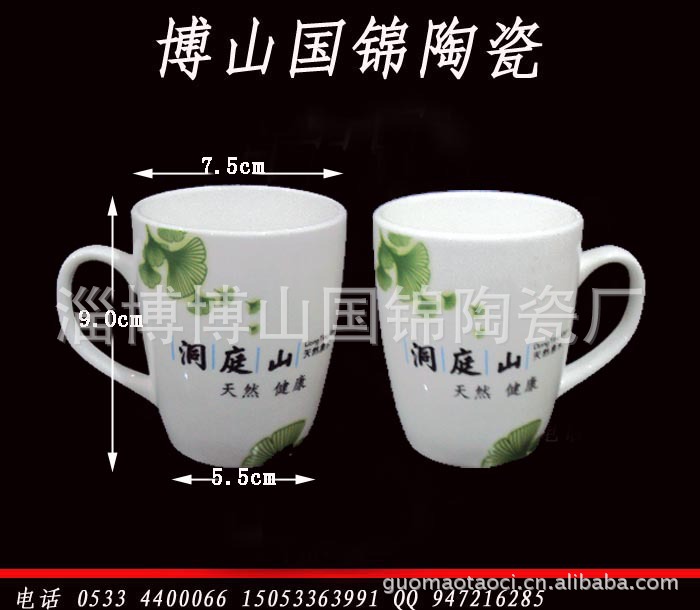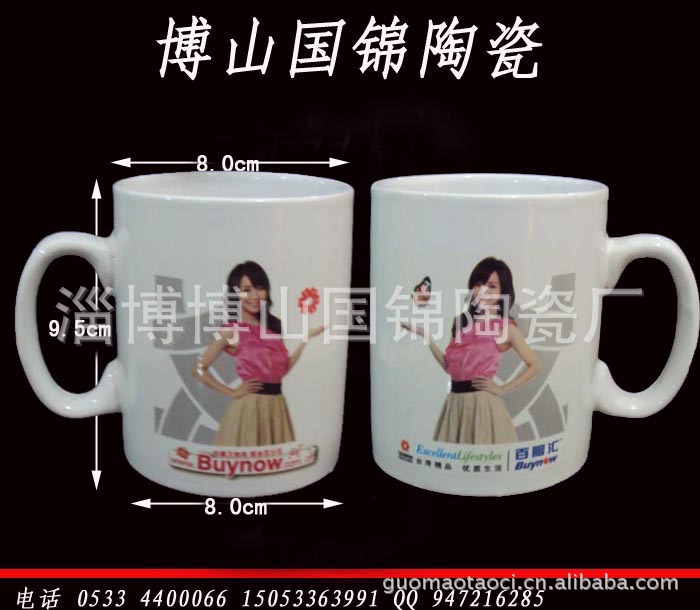 淄博博山国锦陶瓷厂是以生产骨瓷.强化瓷.炻瓷.白瓷为主要瓷质的生产厂家,公司拥有先进的生产制瓷技术,年生产能力1000多万件。主要生产和销售镁质强化瓷、骨质瓷,新骨瓷、白瓷、炻瓷、颜色釉的专业厂家,主要生产各类陶瓷中西餐具,咖啡具,茶具,马克杯、咖啡杯,广告杯、新骨瓷杯、变色杯,音乐杯、促销礼品餐具、促销礼品茶具等 ,针对国内国外客户,外贸客户,兼营陶瓷出口业务。 陶瓷马克杯是一种经济的广告途径,企业可根据广告促销需要,将商标及信息加工到杯身上,以杯为广告载体,为你传播信息,是非常实效的广告。我司专业制作陶瓷广告杯,,款式有上千余种,颜色丰富。可以定制企业和公司LOGO,做为广告赠送礼品,或者促销活动中使用。陶瓷材质分为高温白瓷,强化瓷,骨瓷等。客户可以自己选择杯子材质和款式,或者我们根据客户需杯子用途为客户推荐款式。我公司专业知识丰富,质量控制严格,给每一个客户提供高质量的产品。