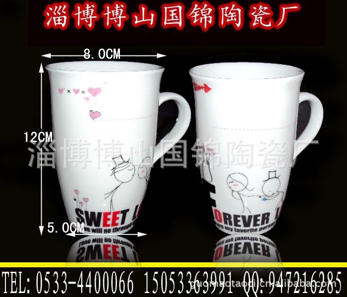 淄博博山国锦陶瓷厂是以生产骨瓷.强化瓷.炻瓷.白瓷为主要瓷质的陶瓷杯生产厂家,公司拥有先进的生产制瓷技术,年生产能力1000多万件。主要生产和销售镁质强化瓷、骨质瓷,新骨瓷、白瓷、炻瓷、颜色釉的专业厂家,主要生产各类陶瓷中西餐具,咖啡具,茶具,马克杯、咖啡杯,广告杯、新骨瓷杯、变色杯,音乐杯、促销礼品餐具、促销礼品茶具等 ,针对国内国外客户,外贸客户,兼营陶瓷出口业务。 陶瓷马克杯是一种经济的广告途径,企业可根据广告促销需要,将商标及信息加工到杯身上,以杯为广告载体,为你传播信息,是非常实效的广告。我司专业制作陶瓷广告杯,,款式有上千余种,颜色丰富。可以定制企业和公司LOGO,做为广告赠送礼品,或者促销活动中使用。陶瓷材质分为高温白瓷,强化瓷,骨瓷等。客户可以自己选择杯子材质和款式,或者我们根据客户需杯子用途为客户推荐款式。我公司专业知识丰富,质量控制严格,给每一个客户提供高质量的产品。
