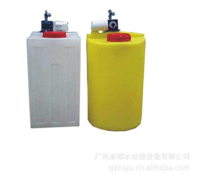 在水处理工程中加药桶主要用于各种药剂的搅拌、溶解、储存,再通过计量泵或水射器将药液投加到各投加点。 加药桶外形分为方形和圆形,材质为聚乙烯(PE),通过滚塑技术一次成型,上部预设了计量泵及搅拌机的安装位置,搅拌机、加药桶、计量泵三合一,使用非常方便。 提示:加药桶预设的计量泵及搅拌机安装位置,并不完全通用于所有品牌、型号的计量泵及搅拌机,具体安装时需要由客户根据实际情况作出相应调整