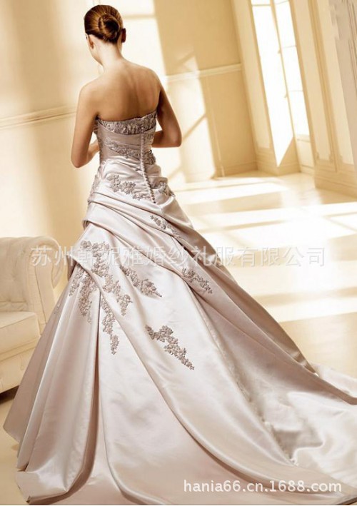 批发供应新款缎面材质排花钉珠工艺高档外贸婚纱来图来样定做