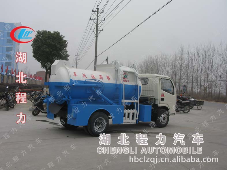 餐厨垃圾车特点:1、垃圾箱横向截面为圆柱框架、纵向截面为梯形框架,两侧及顶面均为圆弧造型,整机显得美观大方;2、罐体容积达6m3,且能实现箱内餐厨垃圾油水的初步分离和垃圾减容,并配备有大容量污水箱;3、与后门总成之间密封性好, 垃圾箱与后门总成之间采用特制加强型橡胶条密封,密封性好,杜绝了二次污染;4、安全性, 采用电、液联合控制,并设置了安全保护开关,保证了各机构动作准确、可靠;5、功率输出自动控制, 发动机功率输出实现全自动控制,非作业时,发动机怠速状态,作业时,发动机自动加速,满足作业功率的要求。避免了功率损耗和系统发热,耗油降低,经济性好;