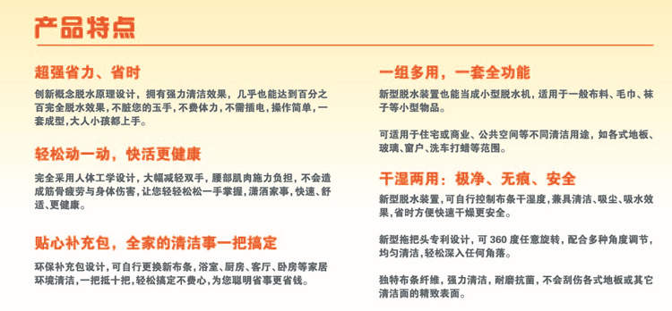 干湿两用/极净、无痕、安全:新型脱水装置,可自行控制布条干湿度,兼具清洁、吸尘、吸水效果,省时方便快速干燥更安全,新型拖把头专利设计,可以360度任意旋转,均匀清洁,轻松深入任何角落,独特布条纤维,强力清洁,耐磨抗菌,不会刮伤各式地板或其它清洁面的精致表面。