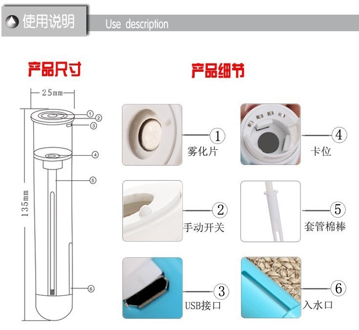 配置:1X彩盒包装、1XUSB连接线、2X棉棒、1X加湿器、1X说明书.