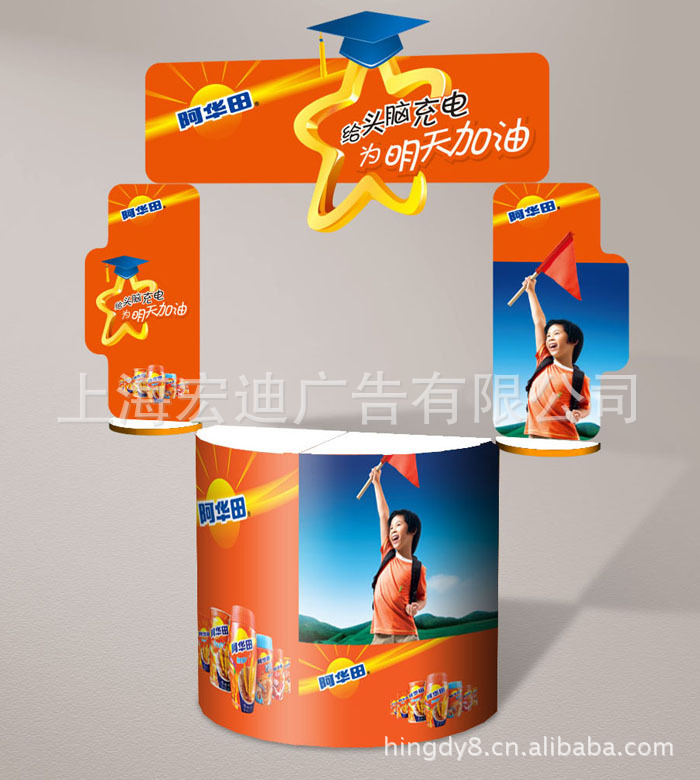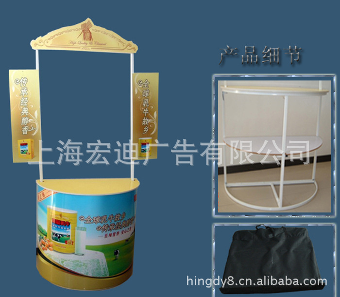 | 品 名:半圆铁促销台 重 量:10KG 画面尺寸:80*120cm) 包 装:黑色牛津布包 材 质:防火板,pvc画面写真 | | | |