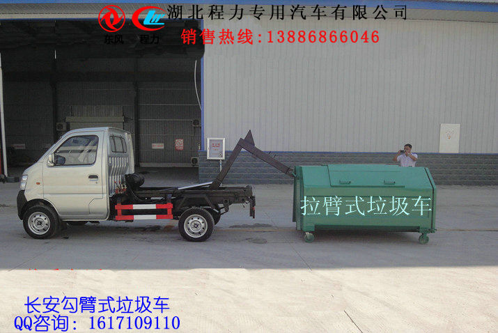 车厢可卸载式垃圾车,又称勾臂式垃圾车、拉臂式垃圾车。该车广泛适用与城市街道学校垃圾处理,可一车配备多个斗,各个垃圾点放置多个垃圾斗,带自卸功能,液压操作,方便倾倒。该车的箱体部分完全由液压系统来控制,在平日里可将车载垃圾箱放置到各个垃圾收集站,待垃圾收集满后,该车可直接开赴至垃圾站,通过液压系统的操控,可将垃圾车后座上加装的勾臂放下,挂住站内垃圾箱前端的连接点,将垃圾箱拉至车体的后座上,此时即可启动车辆,将垃圾运送至垃圾处理站内,进行自卸式倾倒。该车最主要的优点就是可一车配多斗,一辆车就可以维持数个垃圾收集站的运转,效率高,且箱体为密封式设计,不会造成二次污染。