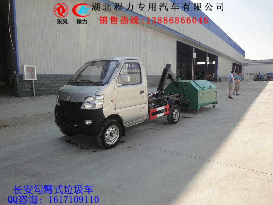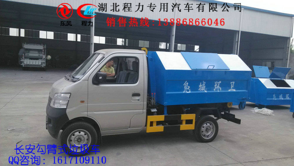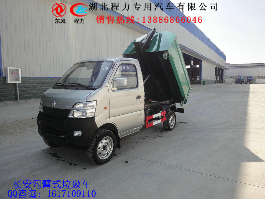 长安勾臂式垃圾车配置:长安原装底盘,新款驾驶室,轴距2.5米,国四汽油发动机53马力,5档变速箱,前盘后鼓刹车,165真空胎,垃圾斗边3mm底4mm,加粗拉伸液压缸,勾臂。