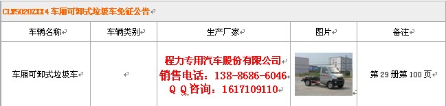现在园林绿化,市政环卫,交通运输等等专用汽车普及我们的世界,专用汽车将会被越来越多的客户所认可,在市政环卫领域,垃圾车专用相当大的一片区域,专用垃圾车必不可少,2014年1月1日以来,汽车有国三汽车向国四汽车转型,所以我们针对政府的要求和广大用车群体的需求,先推出国四合格证勾臂式垃圾车,又名车厢可卸式垃圾车,程力专用汽车股份有限公司销售经理李卫(销售电话:138-8686-6046),为大家介绍我们的新产品: