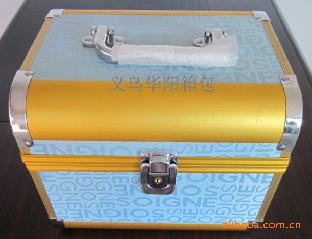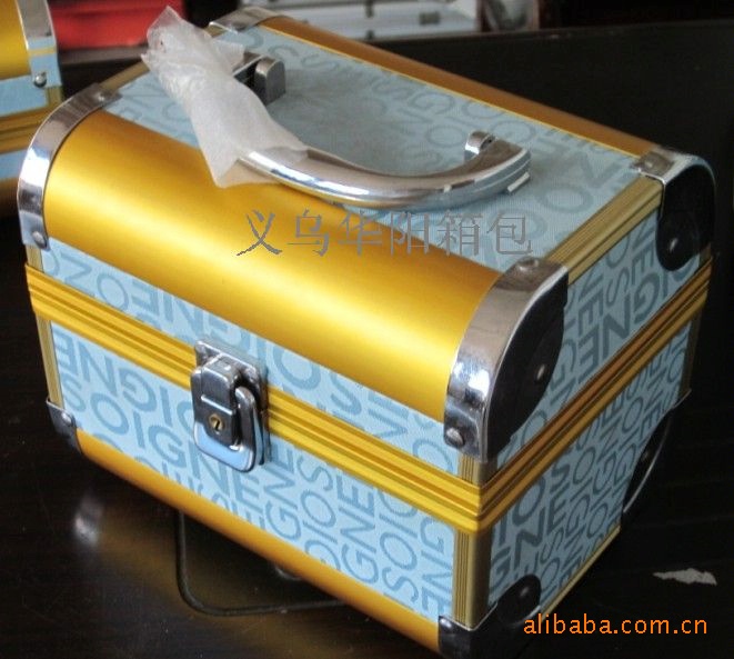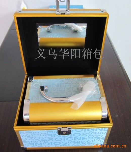 材料:这款产品四周采用金黄色铝条框架,面板采用蓝色皮革面板,同时颜色我们也可以根据客户的需要定制,产品美观大方。(外层纯铝合金制作,其他外面是皮革,里料为绒布,带化妆镜,板扣锁,小号为G小锁)。