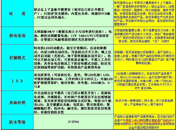 特别注意:由于太阳能安全警示灯产品的用途特殊性,有着地域之间的差别,会产生配备的太阳能板功率大小,阴雨天的工作时间蓄电池的续航能力持久性,会直接影响到你所要采购的产品性能,所以价格是一方面,但是最好是能与我们工厂取得直接联系商榷为好!
