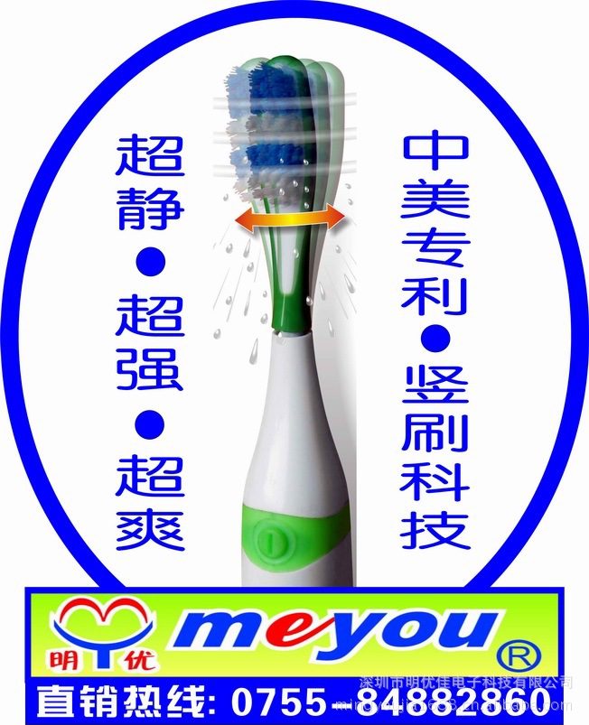 Meyou明优竖直往复式声波电动牙刷:她是深圳市明优佳公司历经数年,精心研发,完全拥有独立自主知识产权的专利产品,她是一款独创的“竖直顺刷、健齿护齿”的多功能新概念的电动牙刷,更是一款独具特色的物美价廉的口腔护理用品。它具有外形美观,手感舒适,噪音低,耗能少,功能多等特点。她的研发成功和上市,完全填补了目前电动牙刷领域里,中高端产品市场的空白,她真正意义上实现了牙医学界倡导的“顺着牙缝上下刷牙”健康理念,能够纠正人们错误的刷牙方式,使牙齿得到全方位的护理,使刷牙过程成为一种享受和乐趣。